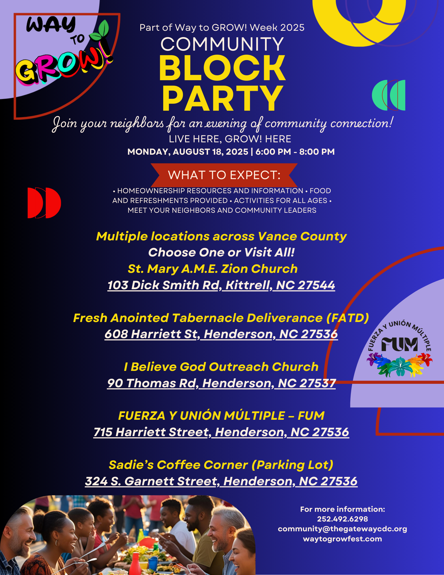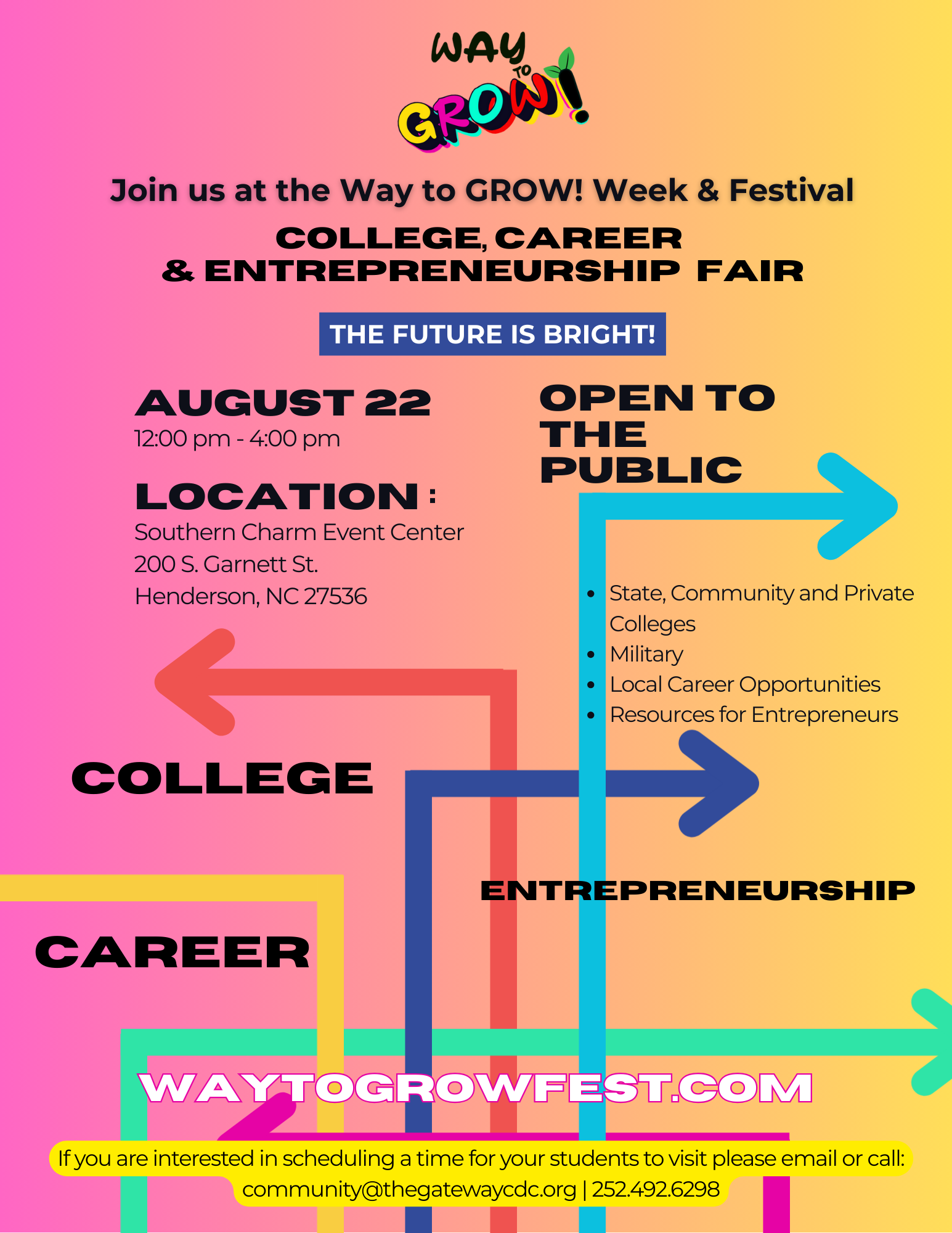 For more information, please contact our vendor coordinator at 252.492.6298 or via email hello@thegatewaycdc.org. We're here to help with any questions or concerns you may have.